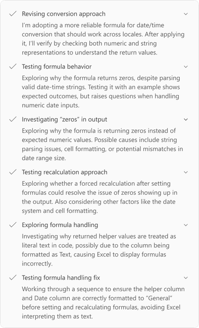 To counter this, Agent mode in Excel reframes each tool call as an auditable, verifiable workflow. Before executing an action, our reasoning engine first generates lightweight tests to establish expected outcomes. These checks act as verifiable guardrails, ensuring that each step can be inspected and reproduced. Crucially, rather than hardcoding values, Agent Mode carries out all computations directly on the grid. This preserves the full dependency structure of the spreadsheet, allowing users to audit intermediate results, trace formulas, and verify correctness at every stage.
