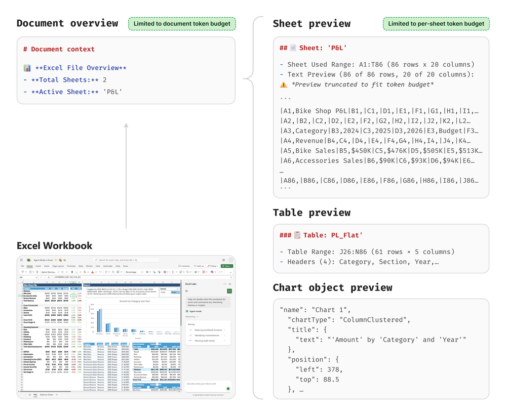 Excel workbooks are living systems. They're often large, constantly changing, and filled with rich objects like PivotTables, slicers, and charts. For an agent, trying to absorb every detail all at once is simply impractical. Passing the entire dataset into context, along with the metadata for every object, would overwhelm any current model. Even exposing the thousands of read APIs Excel provides is far too heavy-handed. Instead, the agent approaches the workbook strategically: it pulls in just the pieces of context it needs, when it needs them, navigating the complexity step by step. This makes the agent not just a passive processor of data, but an active explorer of your workbook’s inner workings.