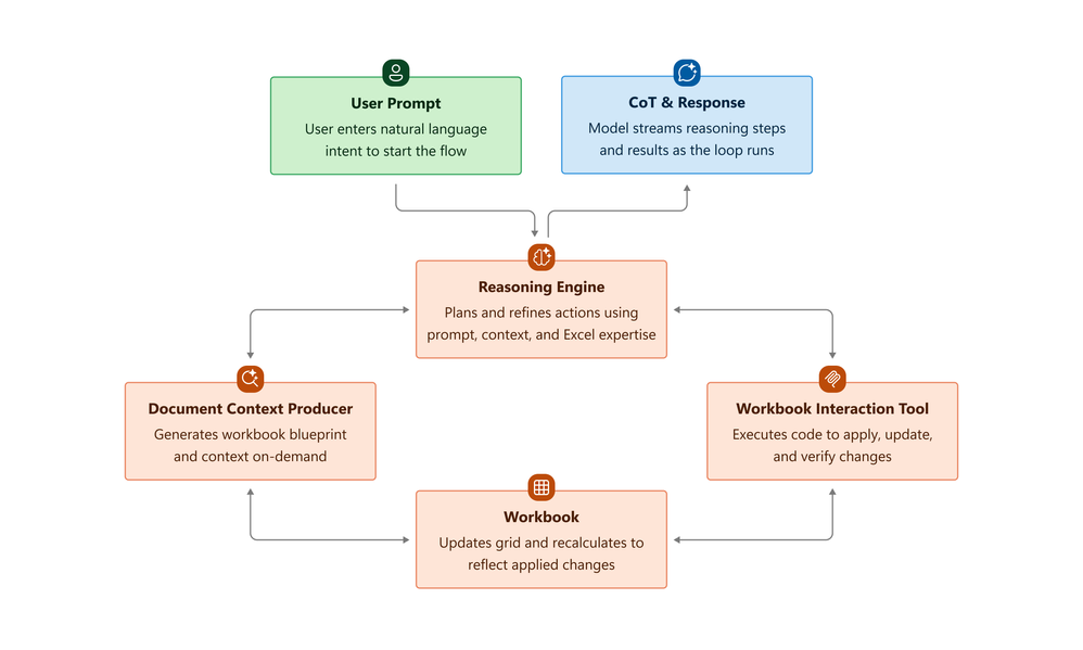 At the center of Agent Mode is a reasoning and reflection loop — powered by the latest generation of advanced reasoning models — that can interact directly with Excel workbooks. Rather than jumping straight into action, our system generates model-ready context from a given workbook and leverages an advanced reasoning model to begin planning for a given task. The system then interacts with the workbook by writing and executing code to carry out that plan, reflecting on the results, and evaluating whether the outcome matches the intent. If gaps remain, the loop continues: revising the strategy, pulling in additional context, and exploring alternative approaches. This cycle of planning, execution, and reflection continues until the system determines the task is complete. By combining planning with reactivity, the agent can chart a path, adjust when needed, and ultimately deliver solutions that feel intentional and well thought out.