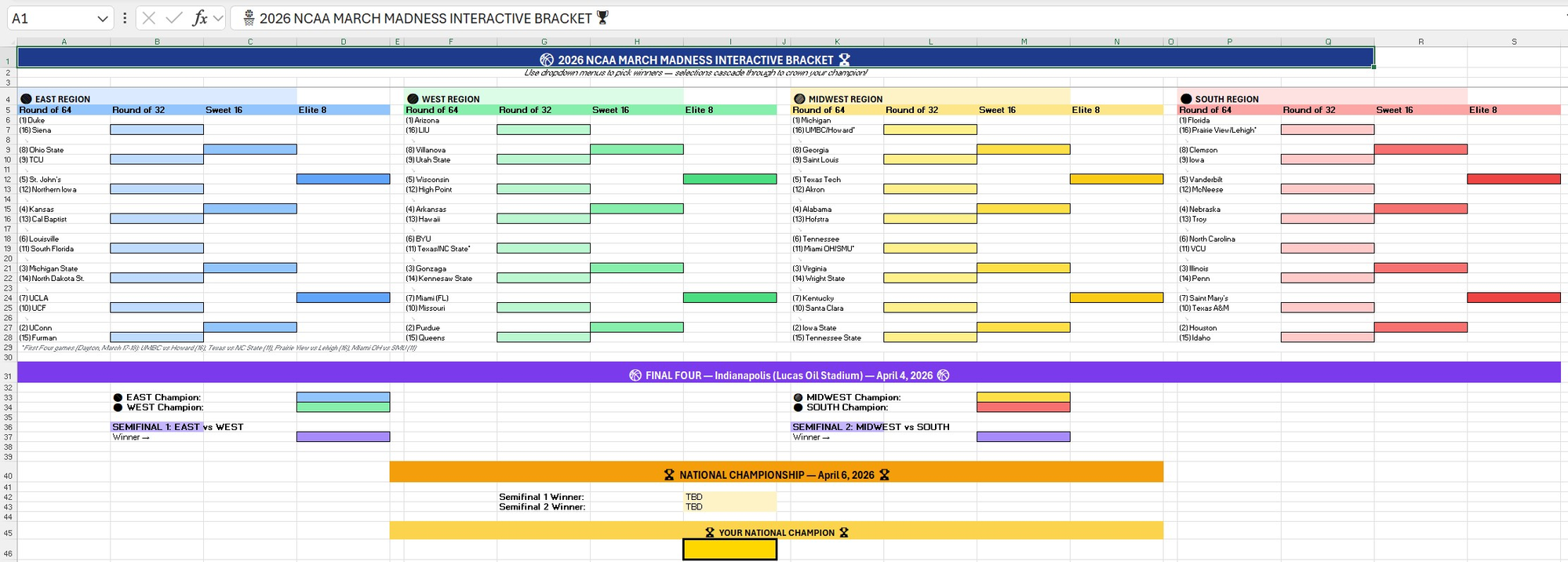 “Create a 2026 [men’s or women’s] college basketball bracket including all the latest teams and seeds. Build dropdowns for each round so I can choose the winner of each matchup all the way to a champion, formatted like a standard bracket. For each dropdown, show only the 2 teams in the matchup based on the winners chose in previous rounds using helper columns."