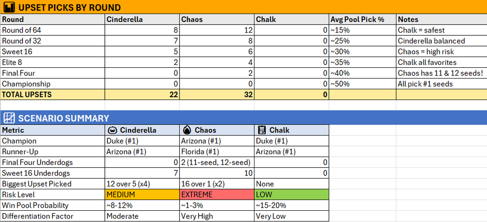 Copilot can generate the comparison table, highlight the key differences, and summarize the tradeoffs in plain language—so you can decide whether you want a safer entry, a balanced upset strategy, or a bold bracket designed to win big.