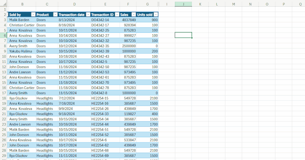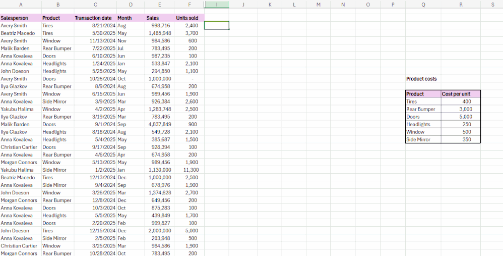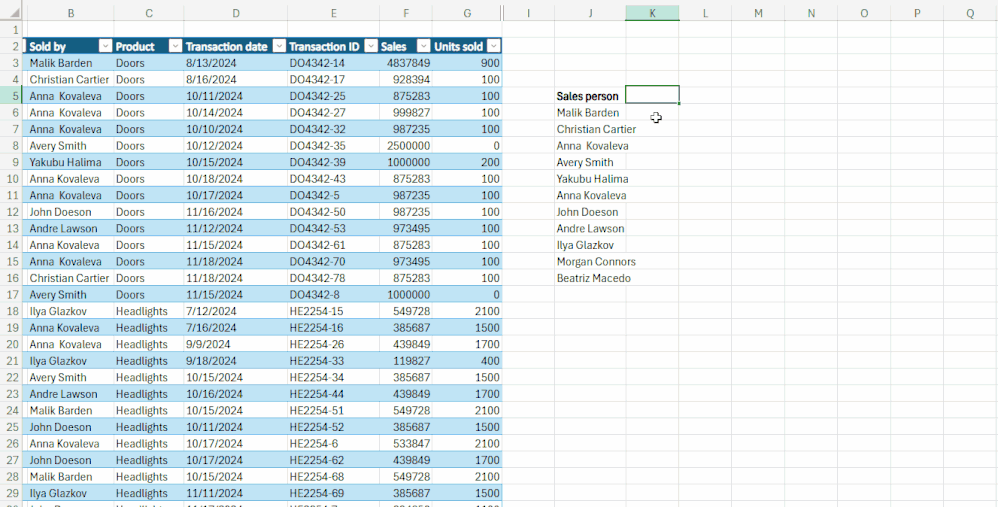- Return a unique list of salespersons from the transactions table.