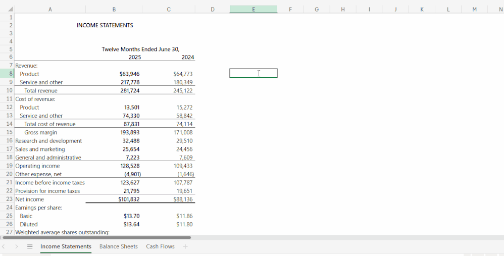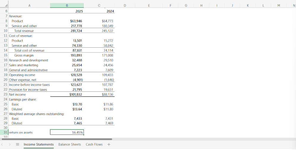 - You can ask for formulas that require data from different sheets, such as calculating the asset turnover rate using values from separate Income Statements and Balance Sheets tabs.