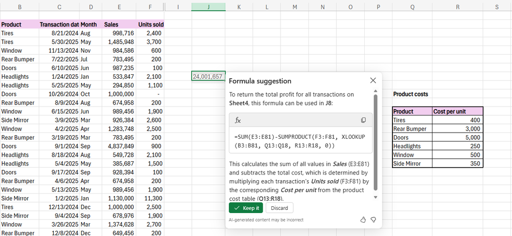 - Review the formula suggestion, the description, and the preview of the result on the grid. Then, select either Keep it if the suggestion works for you, or Discard, and then type = and run the Ask Copilot for a formula option again.