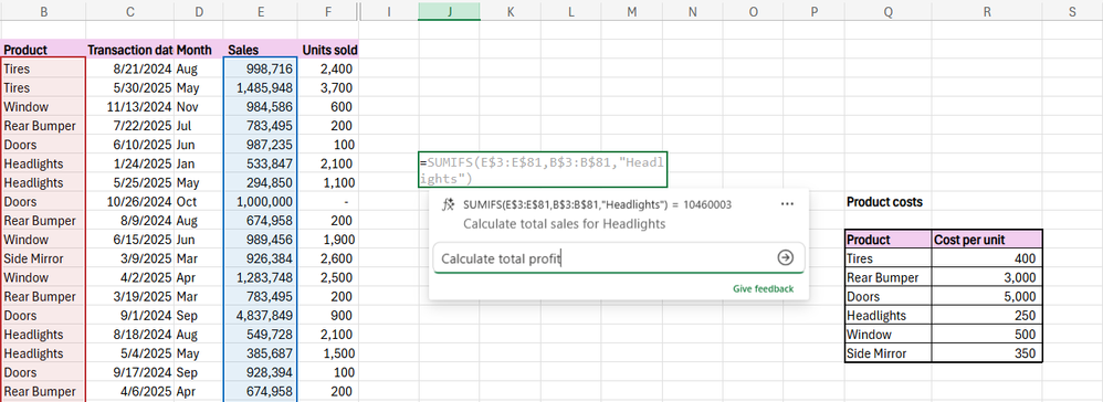- Describe the kind of formula you want in natural language. For example: “Calculate total profit".