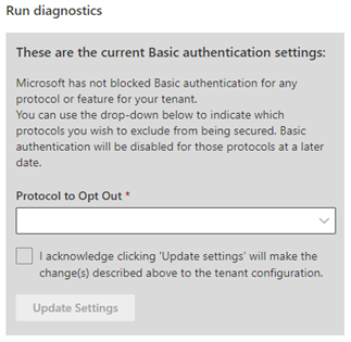 You can now go directly to the Basic Auth self-help diagnostic by simply clicking on this button: (it’ll bring up the diagnostic in the Microsoft 365 admin center if you’re a tenant Global Admin):