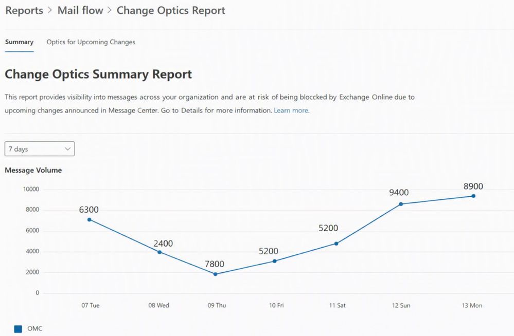 The report can be found in the Exchange Admin Center (https://admin.cloud.microsoft/exchange) under Reports > Mail flow > Change Optics Report