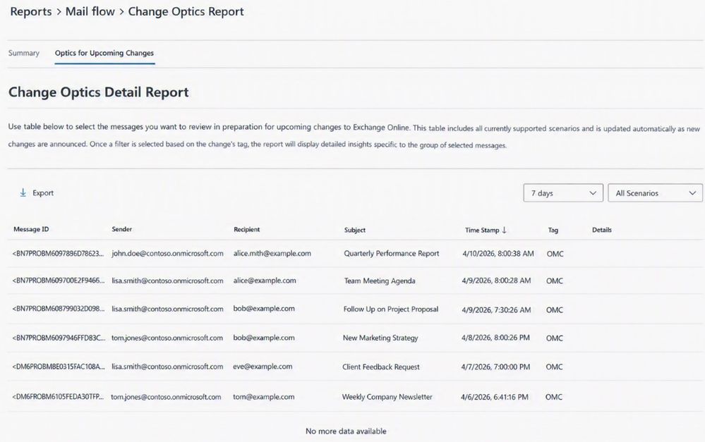 As we improve or identify issues in Exchange Online, there is now a report to point customers to when we announce changes that could affect the sending and delivery of certain messages. This report will showcase multiple scenarios of interest and importance to admins preparing for change. It displays a sample set of messages that have the characteristics that match those expected to be affected.