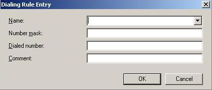 Dialing rule consists of 4 fields – name, number mask, dialed number, and comment. The 'comment' field is optional. The 'name' is the name of the dialing group. The 'number mask' is the number that the user dials and the 'dialed number' is the number that is sent by the UM server to the VOIP Gateway or IP-PBX. Following are the syntax to create dialing rules: