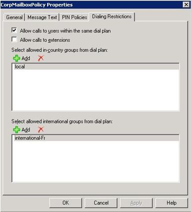 You can set restrictions on "in country" or 'International" dialing groups for any auto Attendant. These rules will take into affect when an anonymous caller calls the Auto Attendant pilot number. You have to specify the name of the 'dial group' that is configured on the dial plan. For Example, if you created an Auto Attendant called 'CorpAA' which is linked to 'CorpDialPlan' then you can specify the groups that are already configured on the dial plan 'CorpDialPlan'. In the following example there is a 'dialing group' called "low-rate" configured in the dial plan that 'CorpAA' is linked to. You have to apply the rule using the following Exchange Management shell command: