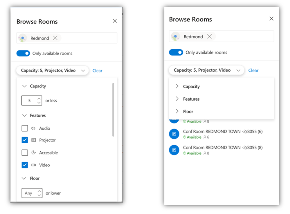 Sometimes you need a room with specific features. Now, when you are looking for a room with capabilities or trying to accommodate a group of people, you can filter for rooms based on capacity, features, and floor.