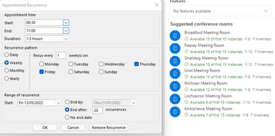 Creating a recurring series already demands a lot of coordination. Outlook has resources to help you with that, the Scheduling Assistant, FindTime, and smart time suggestions. They all help you find a free time slot among your attendees but finding a room that could be booked for the entire recurring series was a little more hectic. We’re making that process easier by showing you when a room is free for the entire series or for how many instances of it so you can book with confidence. This feature is currently only available for first release customers but will be available for all users in time.
