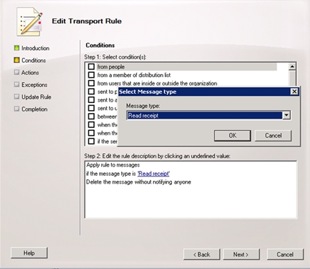 With Exchange 2010 we have many new additions to transport rules which would make the subject of a great blog post on its own. The one new addition we are concerned with here is the ability to act on messages based on class. Specifically here we are concerned with the read receipt class. With Exchange 2010 we can craft a transport rule to drop messages based on the read receipt class as shown below:
