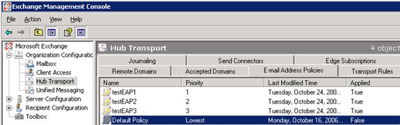 In the Exchange Management Console, the E-mail Address Policies tab of the Hub Transport node under the Organization Configuration work center is the place to create and configure e-mail address policies. If multiple policies apply to the same recipients, the policy with the highest priority (the lower the priority number, the higher the priority) takes precedence over any matching policies with a lower priority.