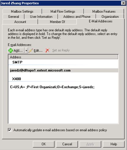 The E-Mail Addresses property page of a recipient in the console allows management of recipient e-mail addresses. You can select whether to automatically update the e-mail address for this recipient based on e-mail address policies by checking or/unchecking the "Automatically update ..." checkbox at the bottom of this property page.