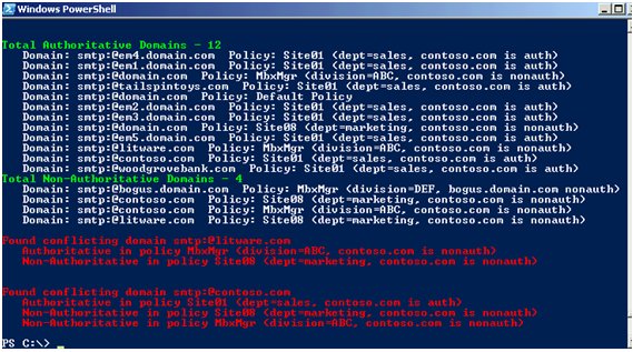 Notice that the screenshots show recipient policies which are appropriately-named for this blog. However, in real-world environments, they are rarely named descriptively. Another challenge is that not all of the policy objects (such as pure mailbox-manager policies) will have visible e-mail settings, in which case you would need to temporarily enable the "e-mail addresses" property sheet to expose the addresses written to those policies when they were created (which could have been years ago). Lastly, an admin would be prone to error if he/she were to check hundreds of policies in a large environment. Therefore, Marc Nivens took our requirements and wrote a read-only script to assist you in detecting ambiguously authoritative e-mail domain names. Seeing that you might not have any Exchange 2007 servers in the org yet, all you need is a machine that has Powershell 1.0 installed, and you can copy the script to run it. (Do note that you will need to change your execution policy. If you don't feel comfortable changing your execution policy, you can always author your own script by creating a .ps1 file with notepad and paste-in the contents of our code.) After invoking the script in this lab environment, the contoso.com domain (among others) was found to be ambiguously authoritative: