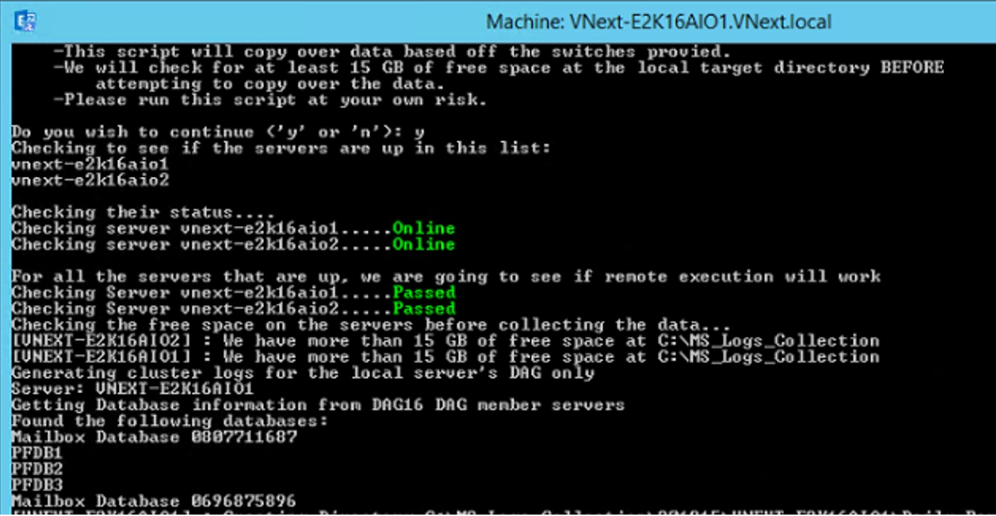 After you have agreed to the disclaimer, the script checks to make sure the servers in the list are up and able to be collected from remotely. Then we do the disk free space check and proceed to collect any Exchange-specific cmdlets as you can’t run Exchange cmdlets within Invoke-Command. If any server fails one of these tests, it will remove them from the list. You will need to collect from any listed servers manually.