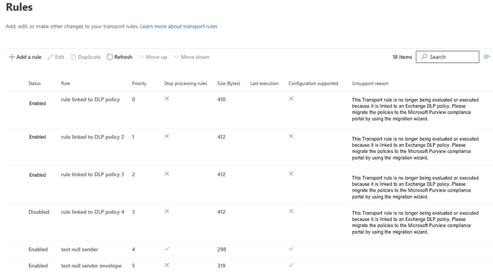 Starting in early August 2023, any rules that match the criteria for an ETR rule linked to a DLP policy that still exist in the EAC will no longer be evaluated and will stop executing (as if the rule is disabled). In these cases, you will see the following new columns in the EAC and PowerShell stating the rules are no longer supported with the reasoning. If you’ve already migrated your DLP rules to DLP policies in the compliance portal, please ensure these ETR rules have been deleted in the EAC as this will help you better manage your non-DLP ETR rules and clean up your environment.