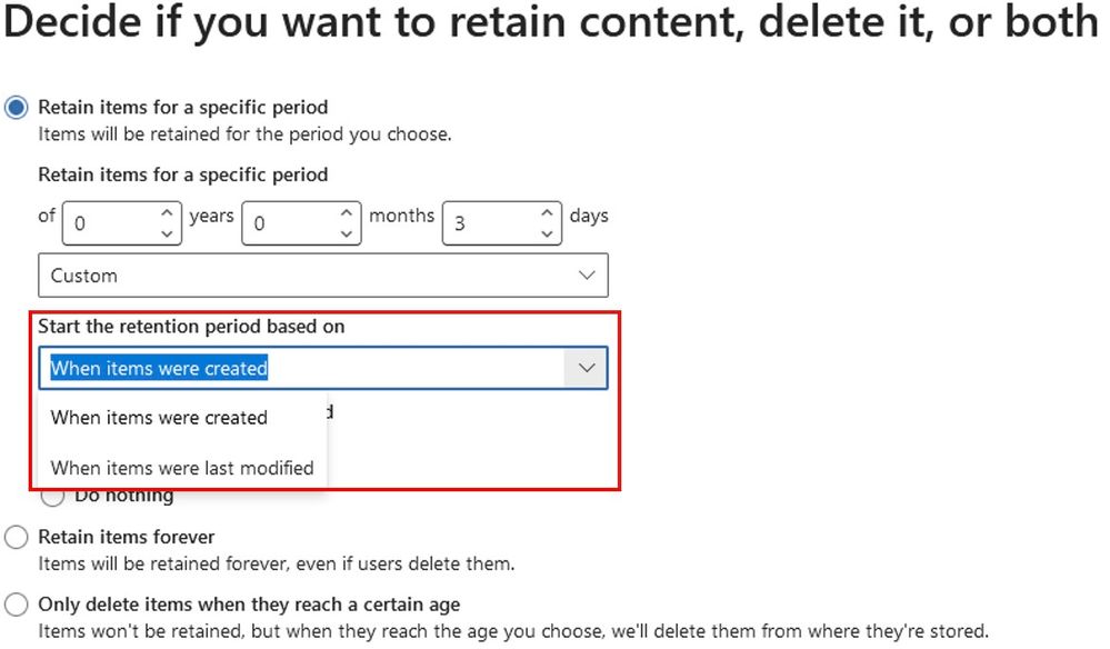 You can configure a retention policy to retain content only, retain and then delete content after a specified period, or delete content after a specified period. The duration of the retention policy can be based on: