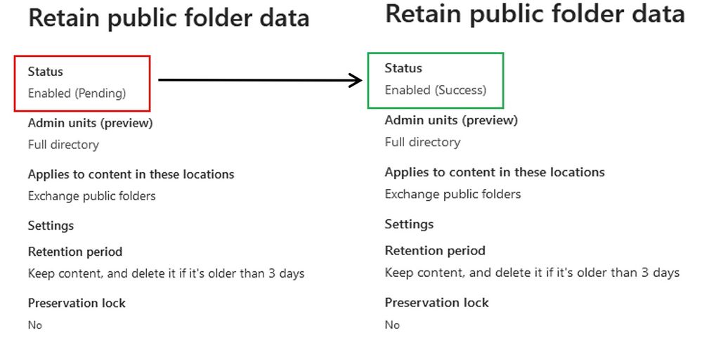 Policy updates are typically applied quickly but may take several days to propagate. Once replication is complete, the retention policy status in the Microsoft Purview portal or compliance portal will change from Enabled (Pending) to Enabled (Success). If the status remains pending, contact Microsoft support for assistance.