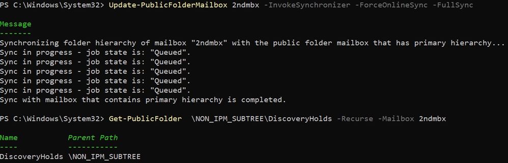 - In rare cases, the DiscoveryHolds folder may not sync to the current mailbox from the primary public folder mailbox. To resolve this, manually trigger a sync using the following command: