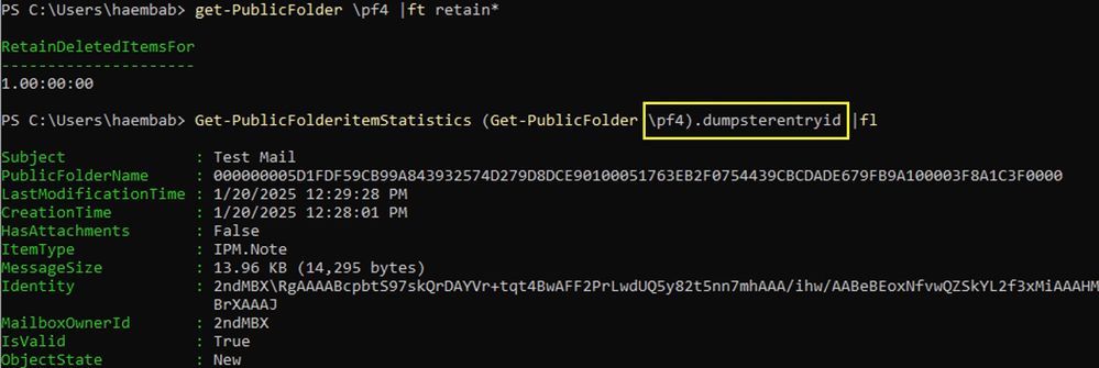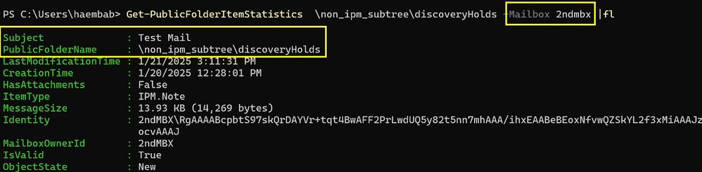 Consider the following scenario: A tenant public folder under retention hold, such as "\pf4," contains an email with the subject "Test Mail" in the content mailbox "2ndMBX." You can validate the presence of the email using the Get-PublicFolderItemStatistics command before deletion.