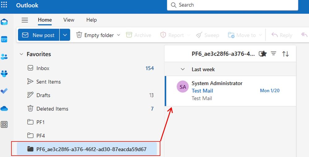 After the parent folder retention deletion period passed we can validate the folder “\pf6” has been moved under DiscoveryHolds folder with new naming as follows FolderName_GUID under the content mailbox of the parent folder e.g. “\pf5” with the email with subject “Test Mail” inside.