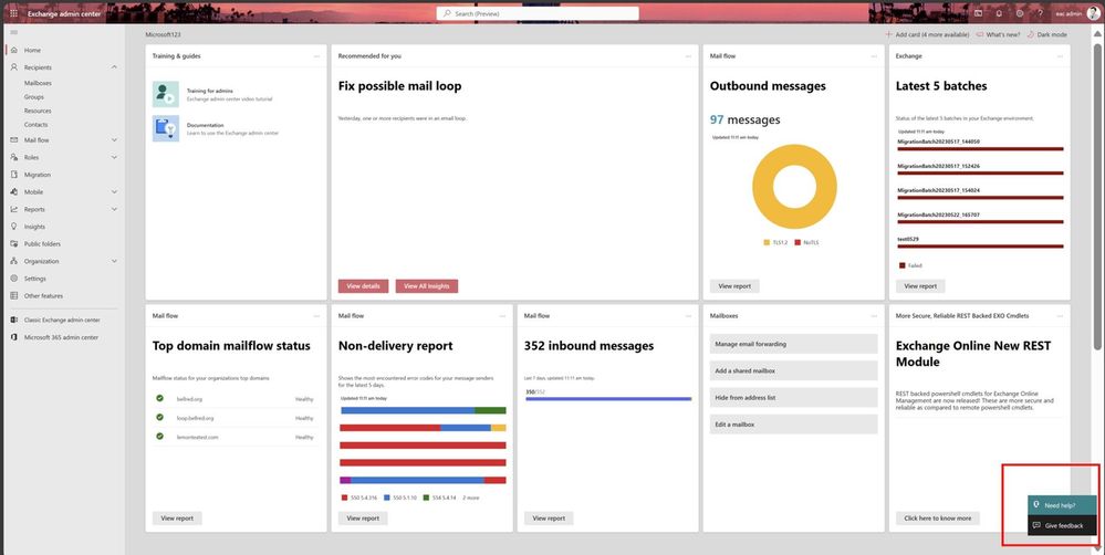 We've also put Give feedback and Need help? at your fingertips. Give feedback enables you to provide feedback directly to the EAC team and Need help? enables you to open a support ticket.