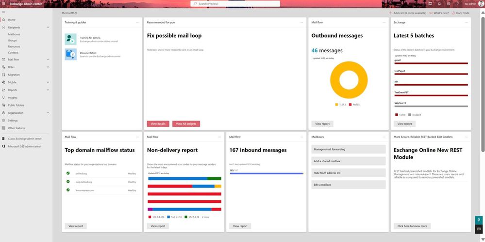 Finally, managing Exchange Online settings, such as mail flow and hybrid configuration, have never been easier thanks to the revamped Settings page.