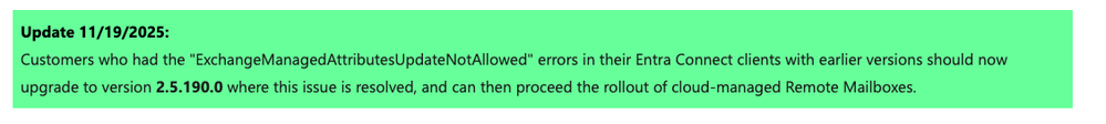 • Phase 1 (Preview – available now) – Introduces per-mailbox control to cloud-manage Exchange attributes. Admins can opt-in individual mailboxes to be cloud-managed (by setting IsExchangeCloudManaged=True). In this phase, admins can also roll back a mailbox to on-prem management (IsExchangeCloudManaged=False). Phase 1 focuses on managing existing user remote mailbox attributes one by one and testing the feature. It will also include an organization-level setting to make all newly synced users Exchange attributes cloud-managed by default (expected in September).