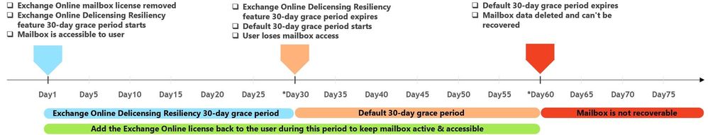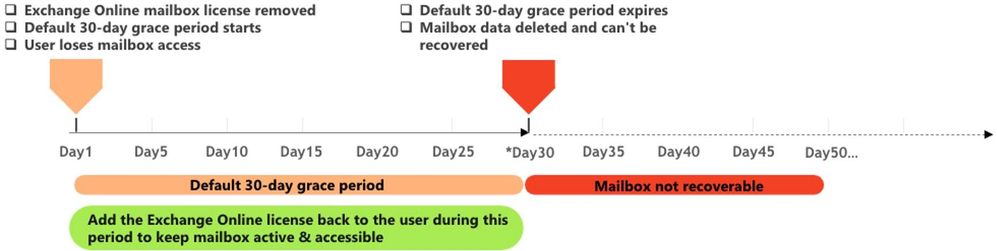 Once the Exchange Online delicensing resiliency feature’s 30-day grace period expires and we remove the license, the user mailbox follows its own default 30-day grace period, during which time the user cannot access the mailbox. However, if the license is added back, access is restored, and the mailbox becomes active. After the 30-day grace period, the data is deleted and can't be recovered.