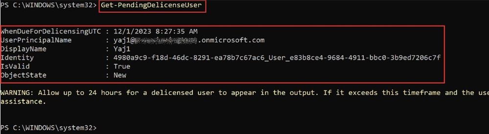 Once the feature is enabled, you can see when the 30-day grace period will expire by running Get-PendingDelicenseUser: