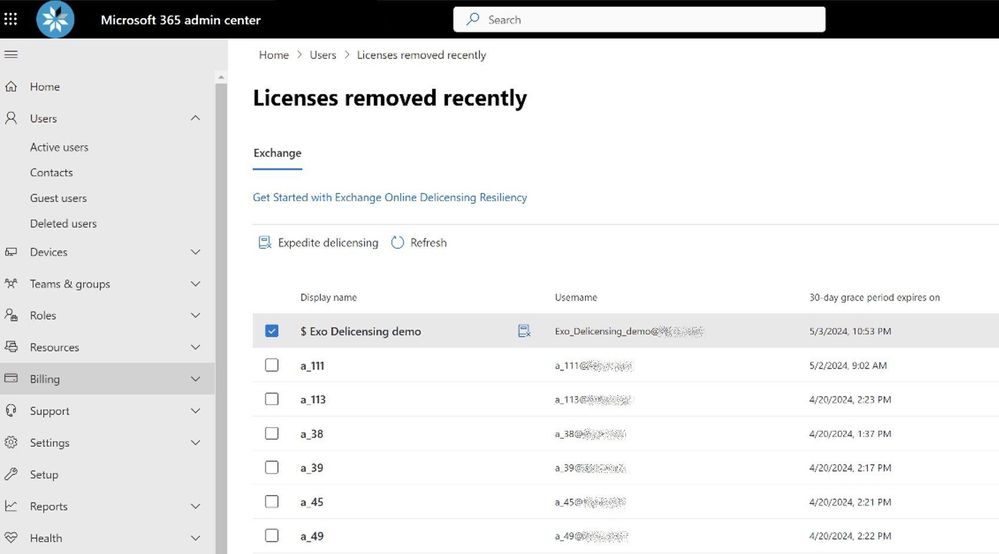 This new feature acts as a safeguard against the immediate effects of delicensing errors by providing a 30-day grace period starting with license removal, providing time for admins to correct any mistakes. During this grace period, mailboxes maintain their pre-delicensing functionality, giving admins the necessary time to address any delicensing mistakes. During this grace period, the admin also has the option to expedite user delicensing, re-license the user, or leave them unlicensed until grace period is over.