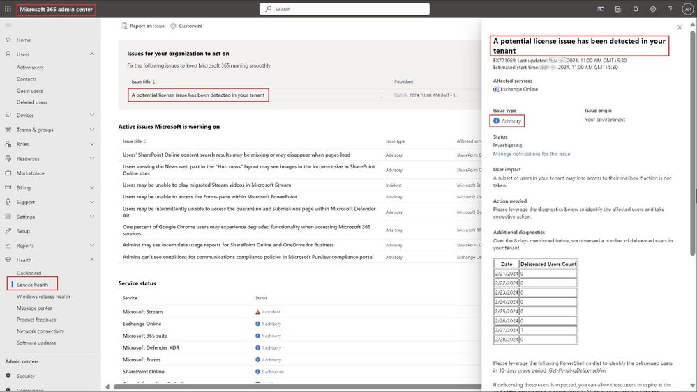 Service Health advisory notifications are designed for admins to receive an advisory digest notification whenever there is any delicensing activity in your tenant. The Service Health post includes the count of delicensed users over a period of 8 days, that are within the 30-day grace period.