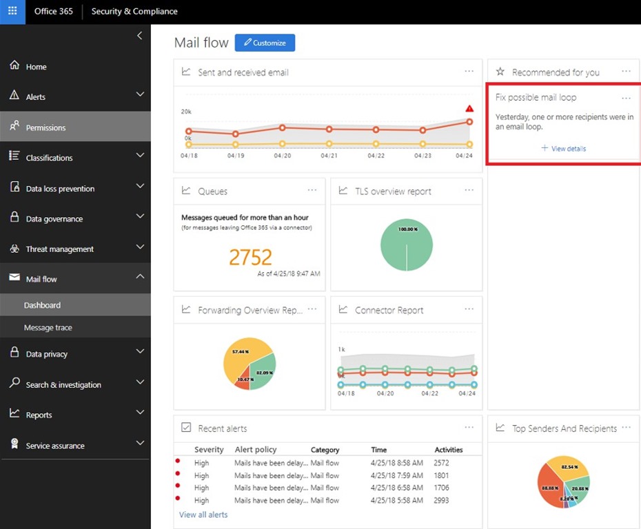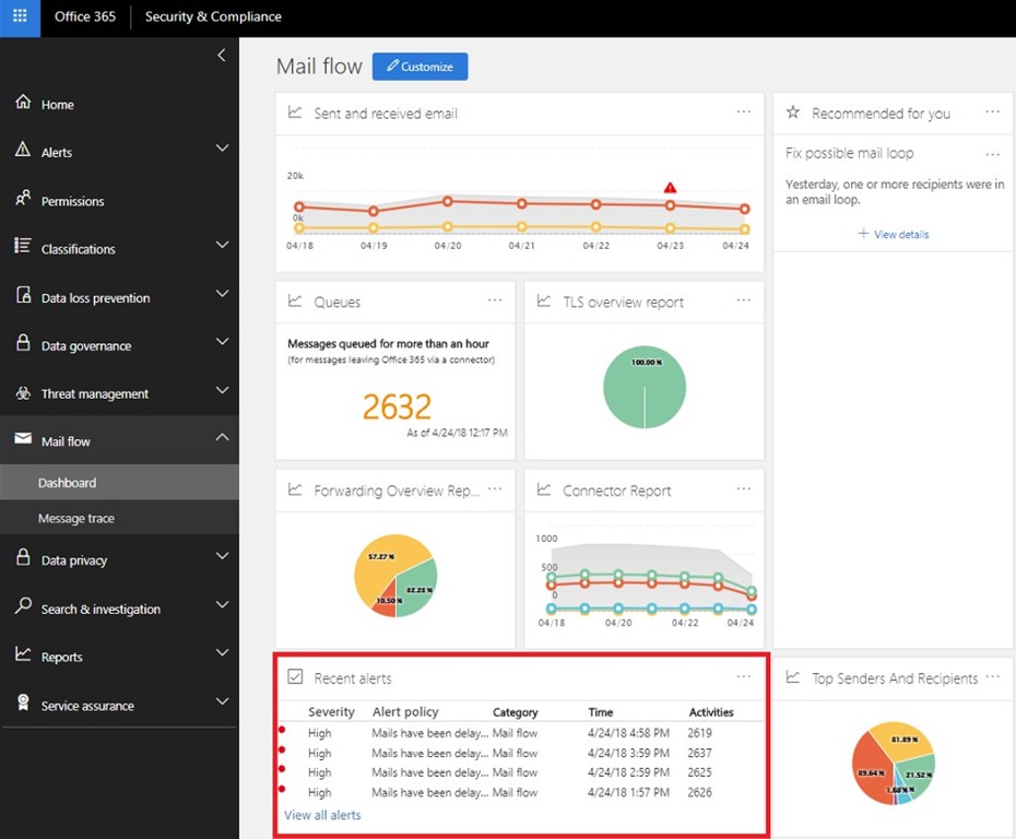We're excited to announce that Mail flow Insights will soon be available in the Office 365 Security & Compliance Center. We'll continue to create and refine mail flow insights to help improve productivity for admins, and we'll announce them as they become available. The first wave of capabilities is being released in May 2018 and we're currently in the deployment stage; features shall start to show up for you on the week of May 14. Admins can use mail flow dashboard in the Office 365 Security & Compliance Center to discover trends, insights and take actions to fix issues related to mail flow in their Office 365 organization. You can see the details in this doc. But a quick summary is listed below.Where to find the mail flow insights
