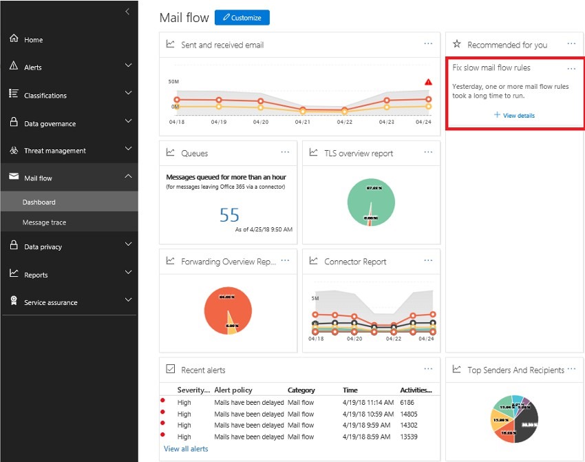 Inefficient mail flow rules (also known as transport rules) can lead to mail flow delays for your organization. This insight reports mail flow rules that have an impact on your organization's mail flow. The insight will help you to identify and fine-tune mail flow rules to help reduce mail flow delays.Updated Jul 01, 2019