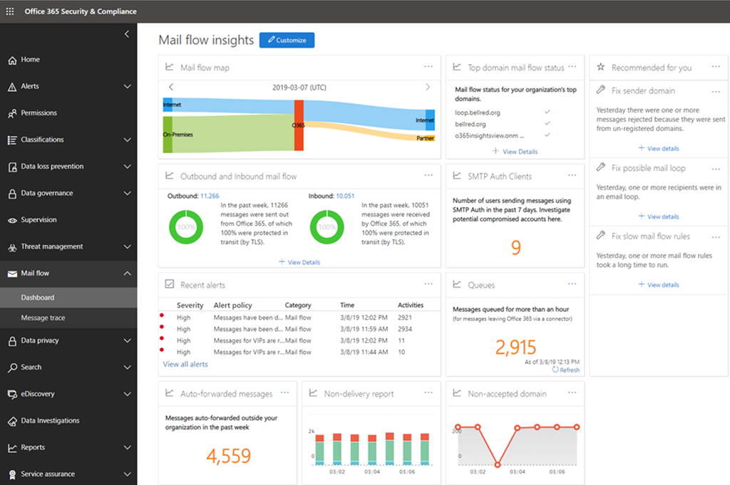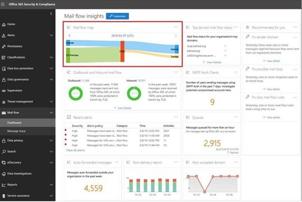 This report provides a visual map showing how mail flows through your Office 365 organization. You can use this information to learn patterns, identify anomalies, and fix issues as they arise.Domain mail flow status