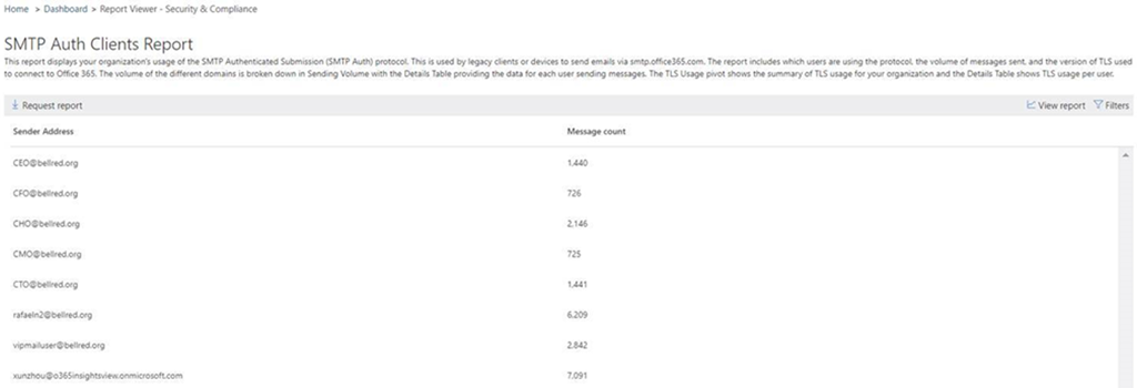 This report allows you to detect potentially compromised accounts due to the use of legacy (less secure) protocols. Clicking the widget will allow admins to see details of accounts that are still using the SMTP Basic Auth protocol, and will allow them to investigate potentially compromised accounts.