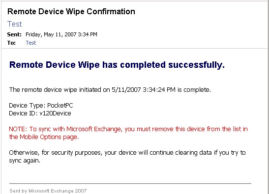 Note: After the remote wipe, if you luckily find your lost device and want to re-sync it, you must remove it from the OWA device list (refer to "Remove mobile device" section for more info). Otherwise, it will keep on re-wiping itself. This is a security feature by-design.