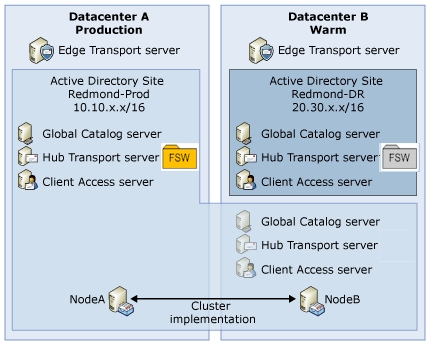 Focusing just on the cluster implementation, we have a two-node CCR environment that during normal production hours has the clustered mailbox server (CMS) hosted on NodeA in Datacenter A, and NodeB is the passive node residing in Datacenter B.
