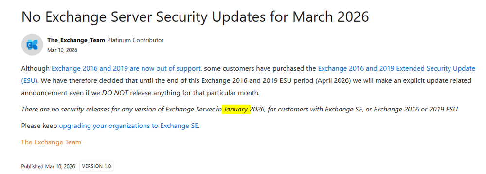 There are no security releases for any version of Exchange Server in March 2026, for customers with Exchange SE, or Exchange 2016 or 2019 ESU.