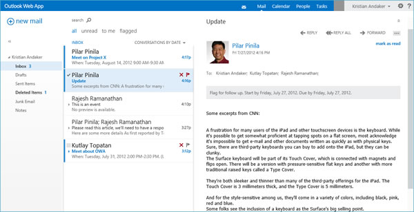 OWA has a new design language that gives it a fresh, modern look that aligns to Windows 8, Windows Phone and the rest of the Office 2013 products. It’s a clean, light, and open approach that enables people to focus more on the communication content, with less distraction. The simplified visual language and interaction models elevate people and content in the experience, and aims to strike a balance between form and function.