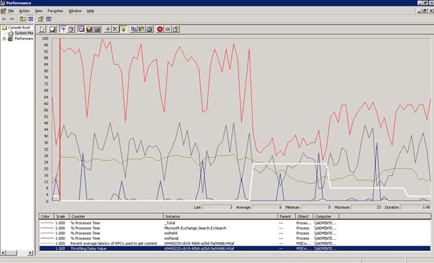 Full crawl is also much faster, but still uses a significant amount of CPU, memory and I/O. During more intensive processing phases, this could in principle disrupt regular mail flow. Since delivery of mail must take precedence over indexing, indexing backs off (throttles) when the load on mailbox server becomes too high. The indexing load is controlled by regulating the number of items (document chunks) that are processed per unit of time. A monitoring thread keeps track of the load on each MDB using the average latency it takes to retrieve documents from the MDB. If this latency crosses a certain threshold (the default is 20 ms), it starts to restrict indexing by setting progressively higher processing delays per MDB (the delay value). Before fetching a document from the MDB, the indexer checks the current throttling delay value, if it's larger than zero, it sleeps accordingly (throttling only occurs during full-crawls).