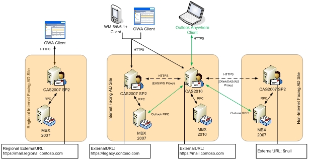 - If the Exchange 2007 mailbox is in a non-Internet facing AD site, CAS2010 will proxy the connection to the Exchange 2007 CAS.