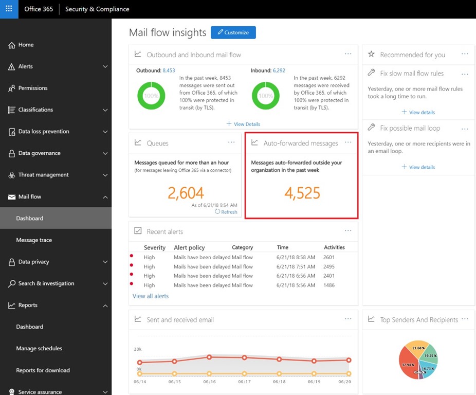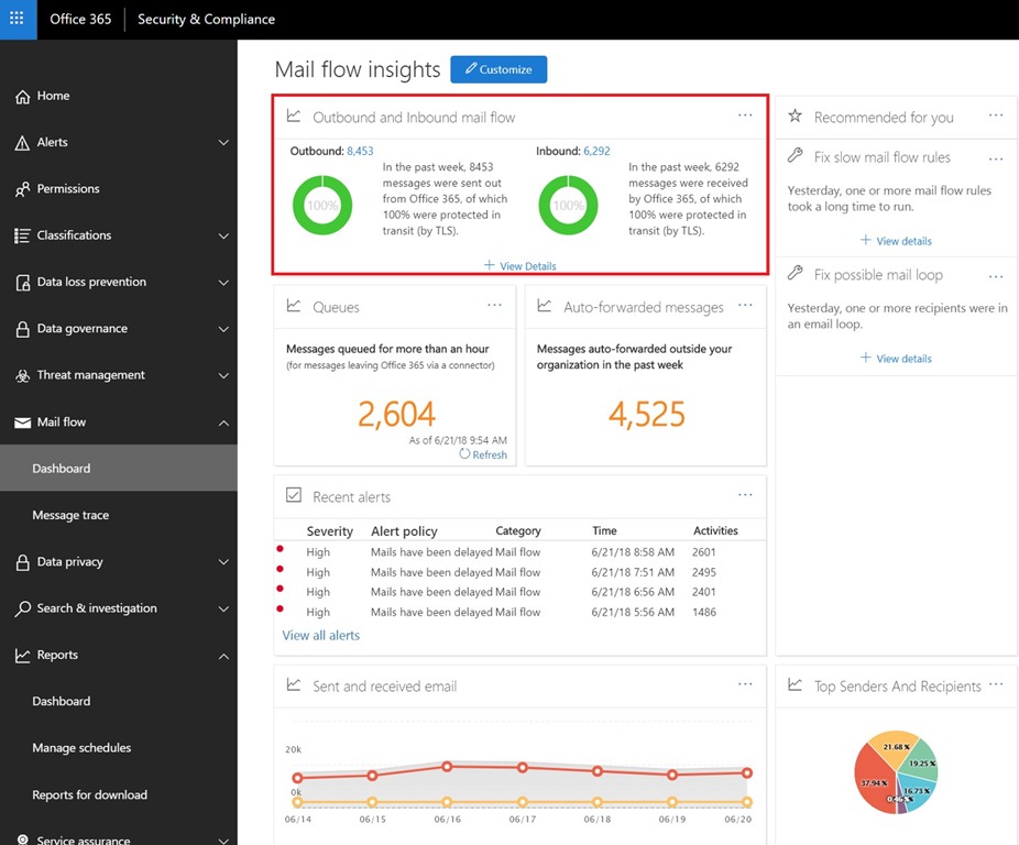 Last month, we announced the release of mail flow insights in the Office 365 Security & Compliance Center in this blog post. We're making changes to the mail flow insights dashboard to make it more intuitive. These changes are currently in deployment, and will be available in the week of June 25, 2018.