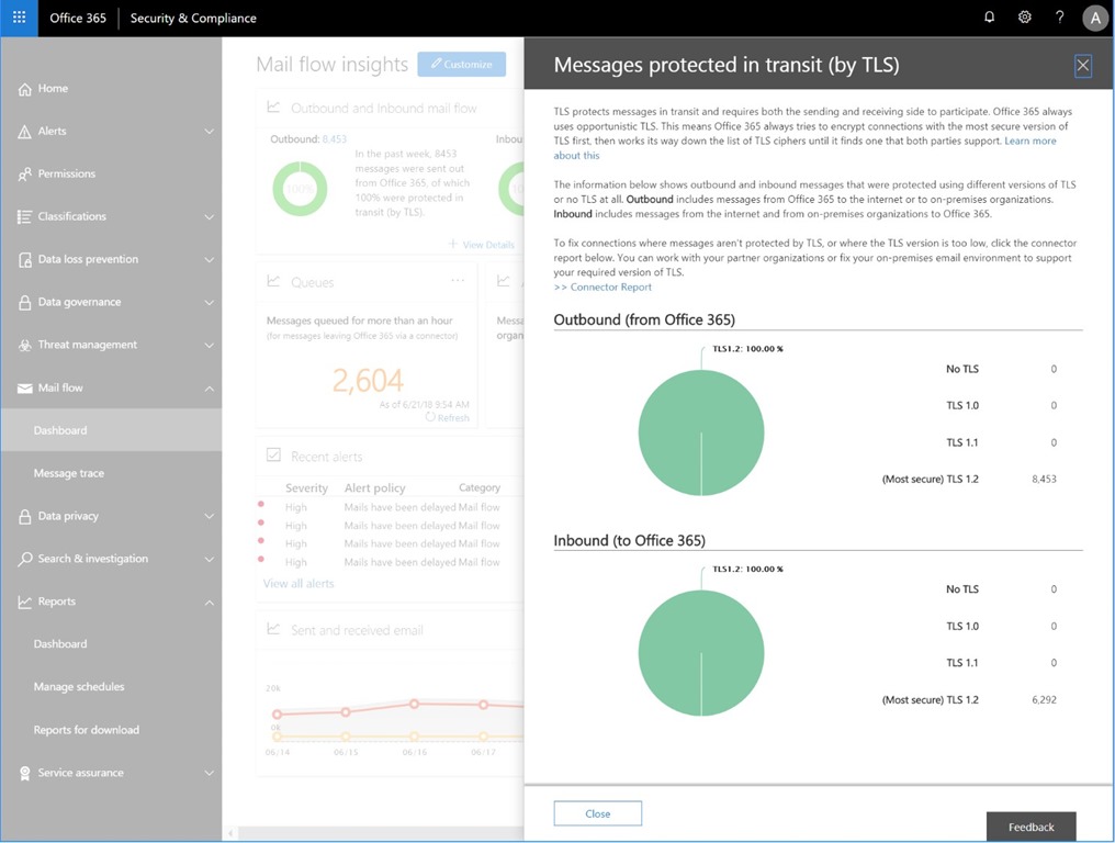 We've combined the TLS report for inbound and outbound email traffic and the connector report into one widget. Clicking View details will give you all the TLS status for your organization, and the connector report link will lead you to the detailed connector report. We will retire the TLS report in the near future since it's no longer needed.