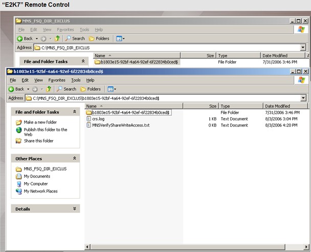 - In Part 4 of the blogcast, once the MNS quorum has been configured to use the file share witness, and once the default cluster group has been taken offline and online, the file share witness will be used. Below is a screen shot displaying the contents of the file share witness directory and its sub-directory on the demo system (\\E2K7\MNS_FSQ_EXCLUS). As you can see, there is very little data in the directory. The load on the file share is very light. The presence of the recently created directory (the long GUID with the $ at the end of it) is evidence of the file share witness at work. Once activated, the MNS quorum with file share witness creates a single file in the directory. In order to prevent split brain syndrome, the current MNS resource owner (the node that currently owns the Cluster Group) acquires an exclusive lock on that file when the other node is down or otherwise unavailable. Only the owner of the exclusive lock may survive when nodes lose communication with each other. The current MNS resource owner will also write membership data into that file. When a node starts and forms the cluster, it will use that membership data to determine whether it has the latest cluster state information and can form the cluster without causing split brain syndrome.