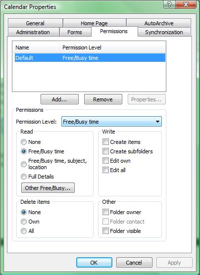 In addition, the Availability Web Service enables the user to share their calendar information in more granular ways. For each target person/group, the user can choose one of four levels of sharing: