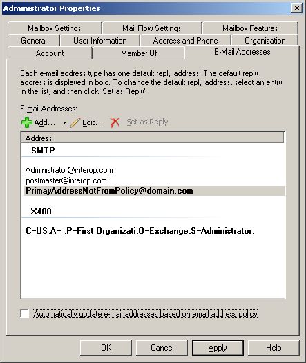 And then, what's the result? Without warning all of the email addresses for these users under the new (now probably not so "new") recipient policy are updated to match the policy template. Reply addresses are changed, former primary addresses are demoted to secondaries, end-users are confused, etc. As mentioned above, this would happen only on users that were created before the new (now probably not so "new") policy was created and never applied.