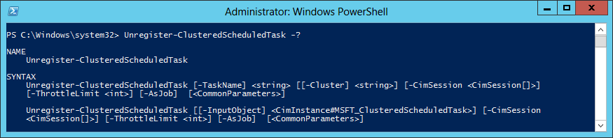 In Windows Server, PowerShell commands from different modules are auto-loaded upon first use. It is important to note that the above PowerShell commands are available through ScheduledTasks module. Notice that the cmdlets have the “Clustered” prefix as part of the noun in the cmdlet. If you try using the cmdlets without the clustered word in it you won’t be creating a clustered task, or querying the cluster for tasks – instead you’ll be using on a regular node (server) scoped task.